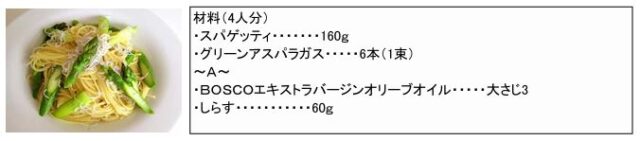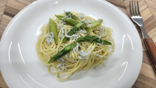 ぎゅーとらトライクッキング グリーンアスパラガスとしらすのスパゲッティ